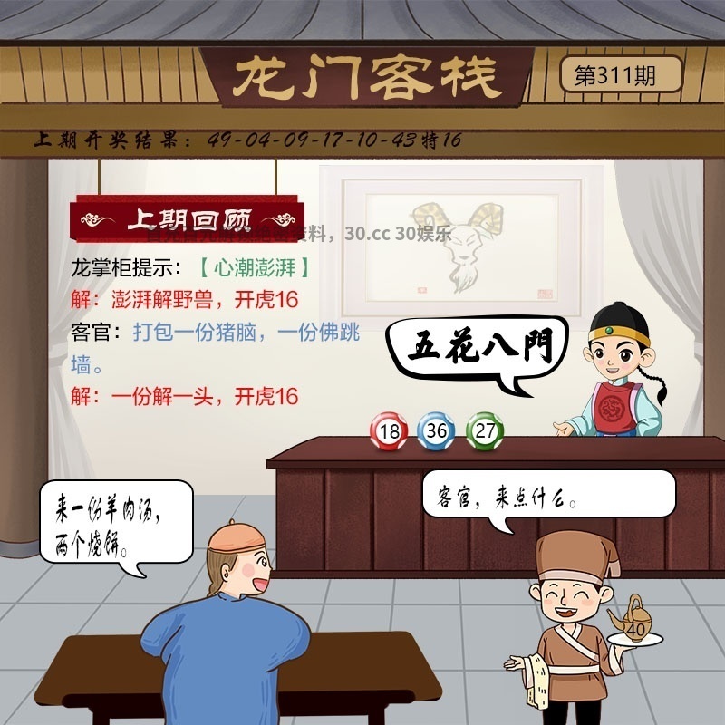 第311期掌柜:五花八門 解:形容事物种类繁多,花样繁杂。 小二:客官,来点什么。 解:无。 客官:来一份羊肉汤,两个烧饼。 解:两个烧饼解双数的生肖虎、鼠、狗、猴、马、龙。 推荐九肖:龙牛马虎猪鸡猴蛇兔 |